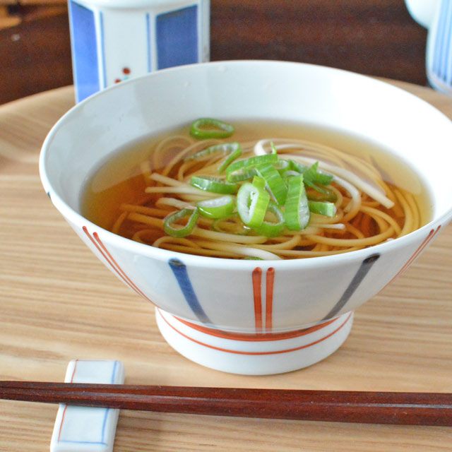 たっぷりとお茶漬けを楽しめる、かなり大ぶりのお茶碗。ちょっとした麺類や丼物にも活躍します♪白磁にあえる赤と藍のラインは手描きらしいあたたかみ。 【砥部焼 梅山窯】ごす赤線の茶漬け碗