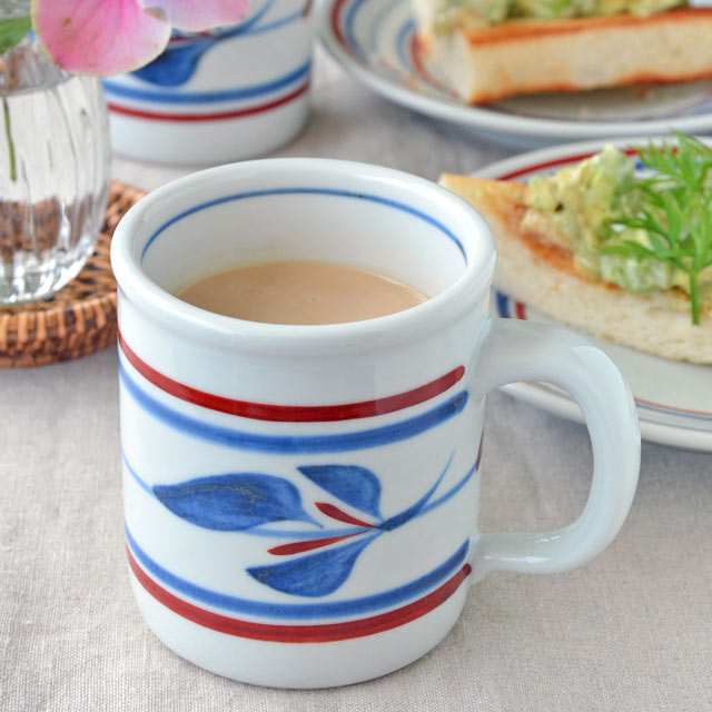 なめらかな白磁に映える藍色と赤の絵付けが美しいマグカップ。使いやすく丈夫ですので、普段使いのカップとしてとても重宝します。 【砥部焼 梅山窯】みつ葉の切立マグカップ