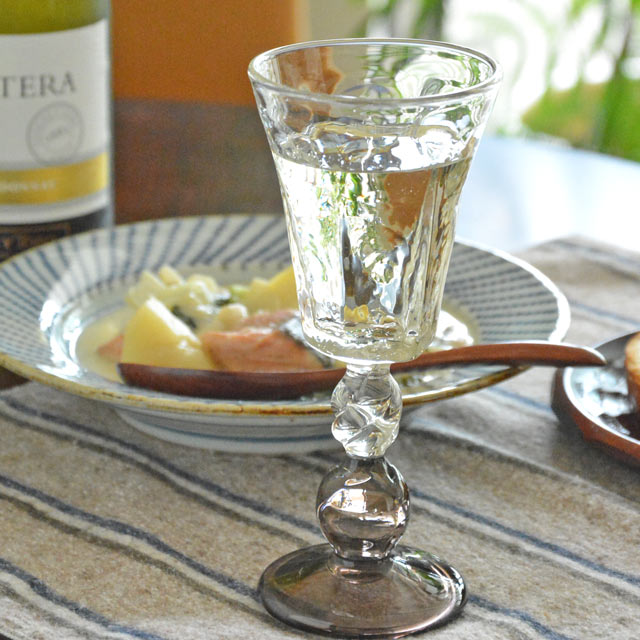 飴色のガラスにアメジスト色が加わってよりお洒落に。手づくりだからこそ表現できるフォルムに魅了されます。特別なひとときにも。 【吹きガラス 村上恭一】六角ワイングラス