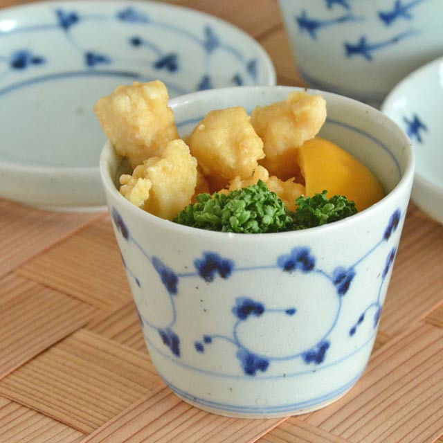 中田窯さんらしいレトロな雰囲気が漂う「からくさ」の文様が魅力の大きめのそばちょこ。フリーカップとして小鉢として、デザートカップとして・・と多用途にお使いいただけるサイズです。 【砥部焼 中田窯】からくさ模様のそばちょこ(大)