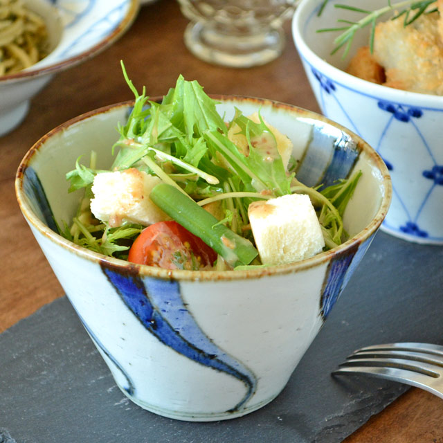 鉄点が入った素地に縁紅と呼ばれる縁の鉄色が魅力の鉢。料理を引き立てる流れある紋様が料理を美しく引き立ててくれます。砥部焼・皐月窯の小鉢。砥部焼専門店 【砥部工房 からくさ】。 【砥部焼 皐月窯】ねじり文の小鉢(大)