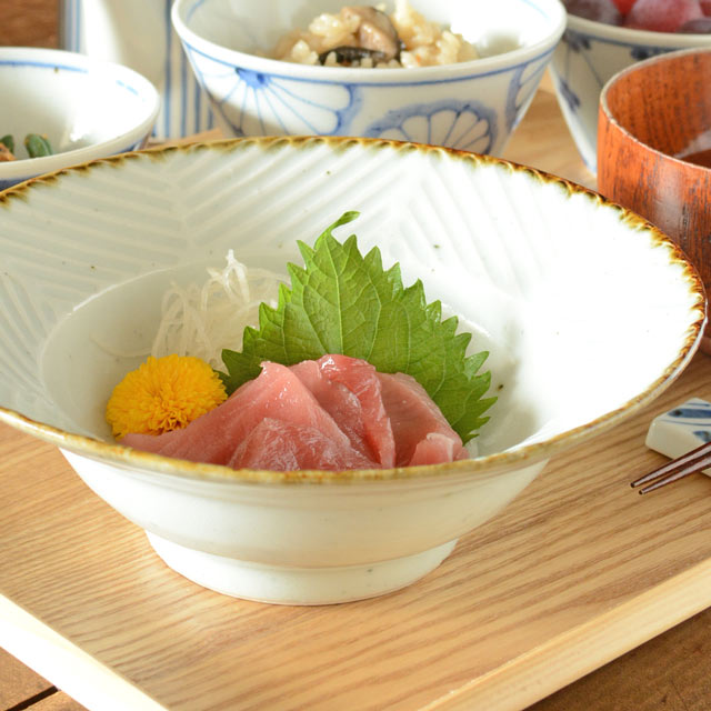 シンプルな中にも手仕事の味わいを感じる鉢。和洋中とあらゆる料理の合わせやすいデザイン。料理が美しく引き立つ広めのリムが特徴です。砥部焼・皐月窯の中鉢。砥部焼専門店 【砥部工.. 【砥部焼 皐月窯】しのぎの縁付鉢(6寸)