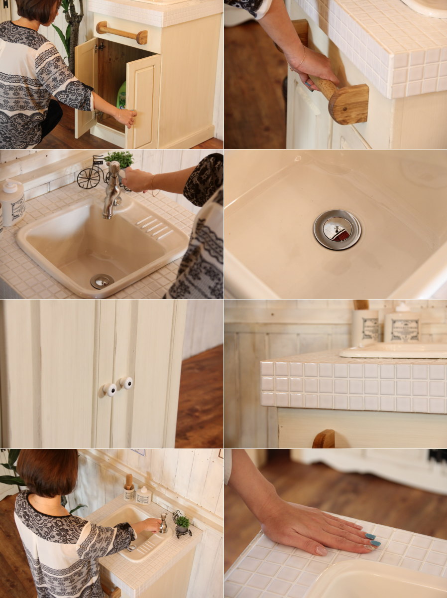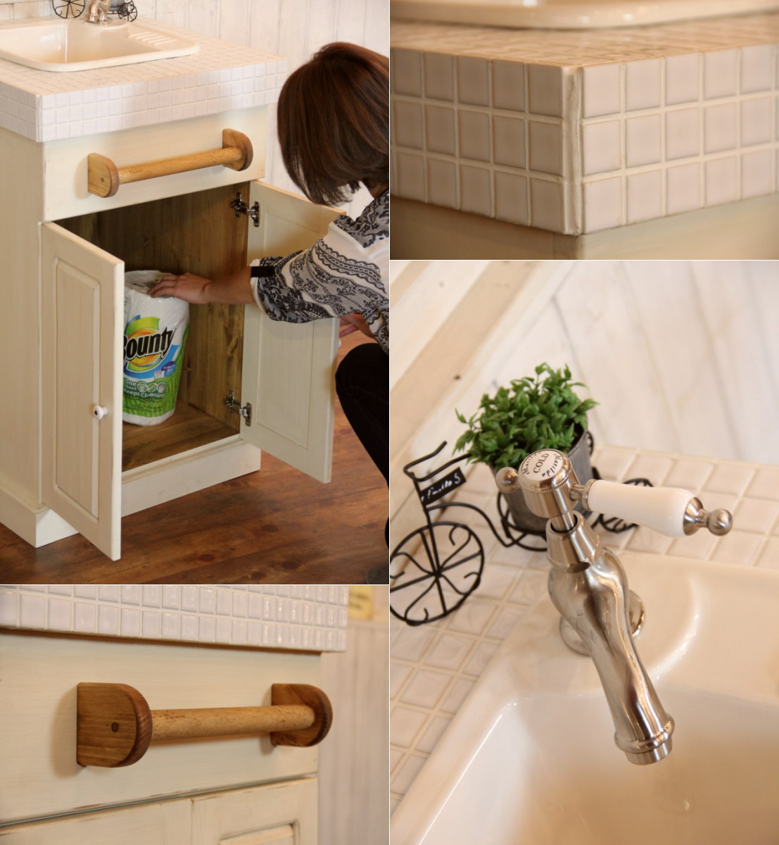タイル天板と小さな洗面ボウルが可愛い洗面台。サイズ変更も可能です。【日本製】 カントリー家具 オーダー家具 手作り家具 洗面台 ドレッサー COUNTRY・タイルウォッシュキャビネット・W550 rfm wct