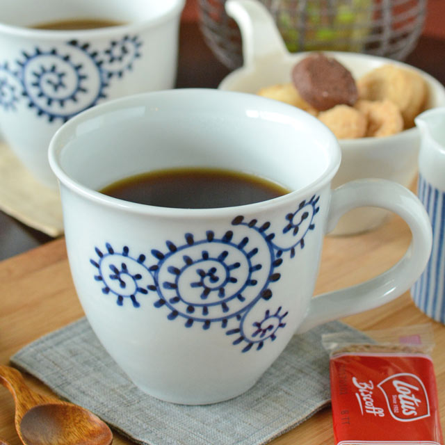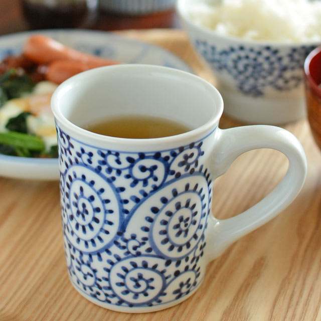 たっぷりと飲み物をいただきたい時に重宝する、ふくよかな形の大きめマグカップ。手描きのぬくもりある「蛸唐草」の染付が、なめらかな白磁によく映えます。毎日のマグカップにおすすめ.. 【砥部焼 千山窯】蛸唐草の丸マグカップ
