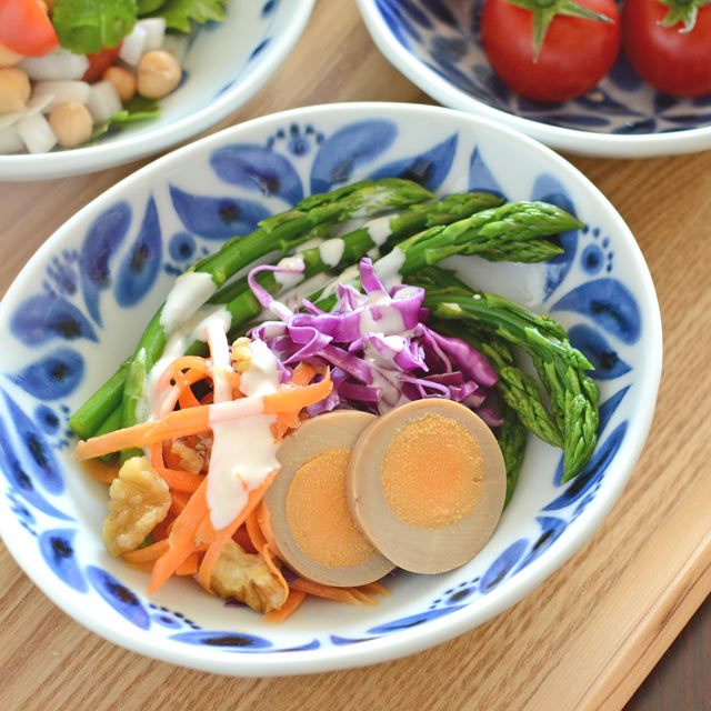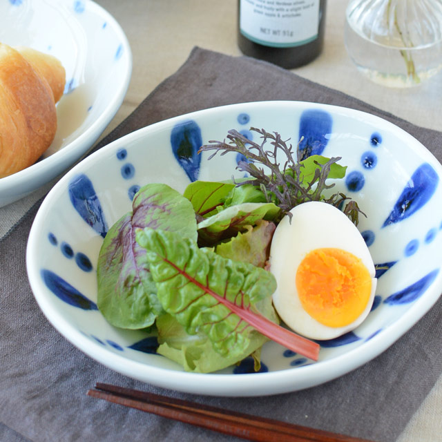 花びらをモチーフにした絵柄が料理を引き立ててくれる楕円鉢。手仕事のぬくもりを感じるかたち。いつもの料理が気軽にお洒落な雰囲気に♪砥部焼・陶房遊の楕円鉢。砥部焼専門店 【砥部.. 【砥部焼 陶房遊】ブルーフラワーのサラダボウル