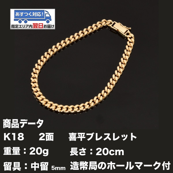 K18 二面喜平ブレスレット(20g-20cm) 最安値挑戦 【送料無料】【全カードOK】【もちろん新品】【信頼の造幣局検定マーク刻印入】 K18 18金 二面喜平ブレスレット(20g-20cm)中留(中折れ) 5mm  2面 二面 キヘイ (20g20cm)中留(中折れ)(造幣局検定マーク刻印入)