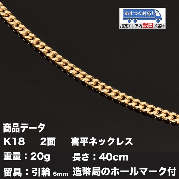 K18 二面喜平ネックレス(20g-40cm) 最安値 挑戦 【送料無料】【全カードOK】【もちろん新品】【信頼の造幣局検定マーク刻印入】 K18 18金 二面喜平ネックレス(20g-40cm)引輪 6mmLプレート  2面 二面 キヘイ (20g40cm)引輪(造幣局検定マーク刻印入)